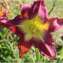 gelb-weisse Mischung, purpurnes Auge, gold und purpurner Rand, grüner Schlund