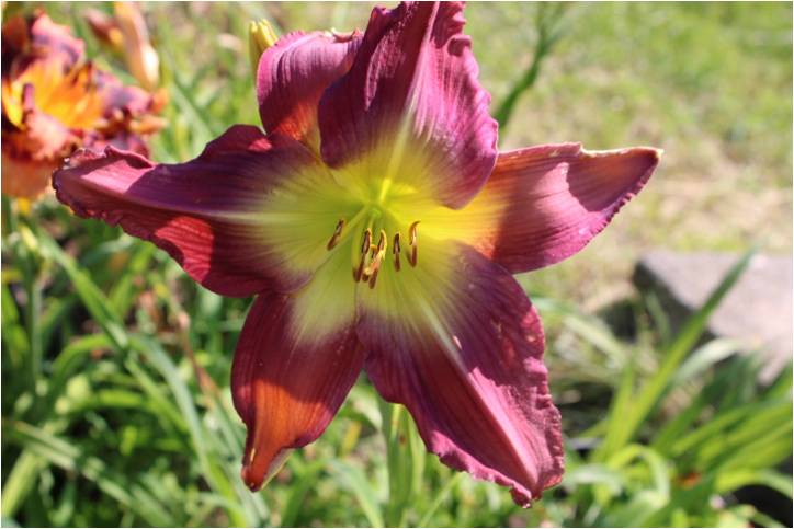 dunkles braun-wein-rot, gelber Streifen auf Petale, gelber Schlund