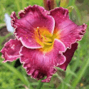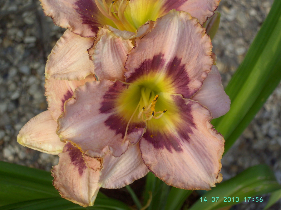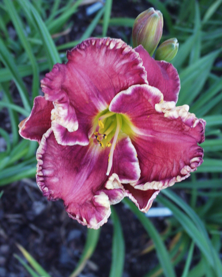 helle rot-violette Mischung, dunkleres Auge, goldener Rand, grüner Schlund