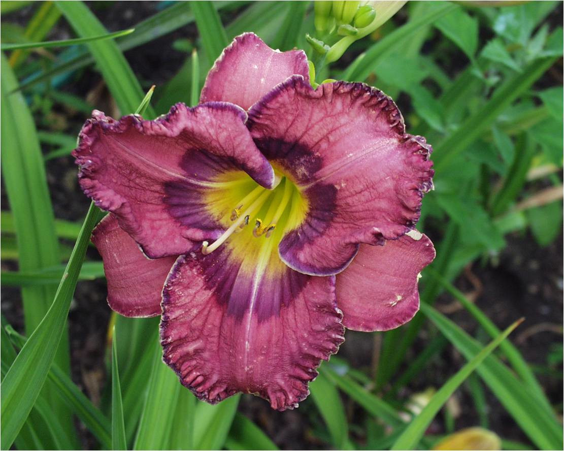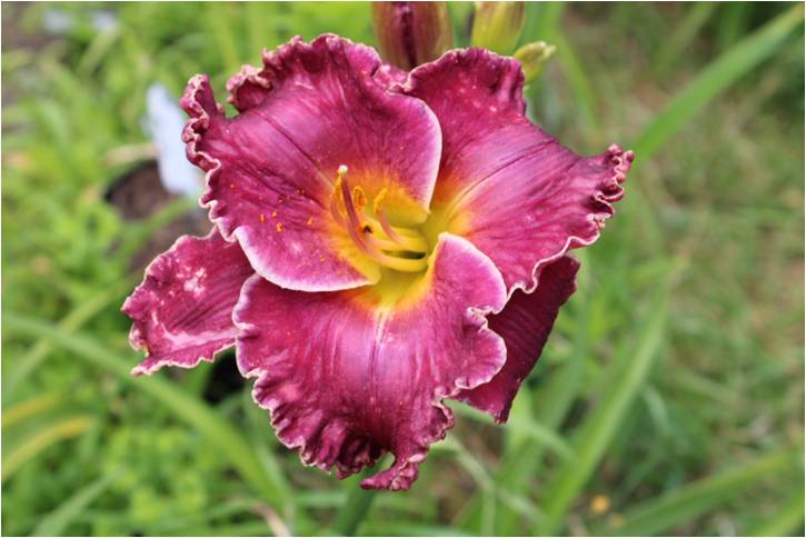 violett, blau-violettes Auge, violetter Innenrand, goldener Aussenrand, gelb-grüner Schlund