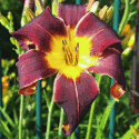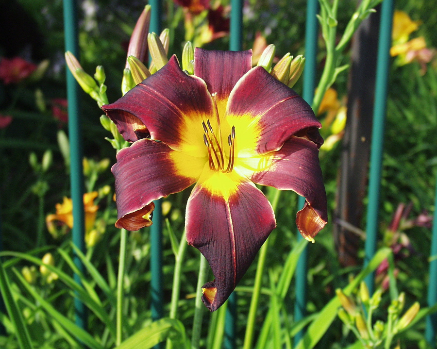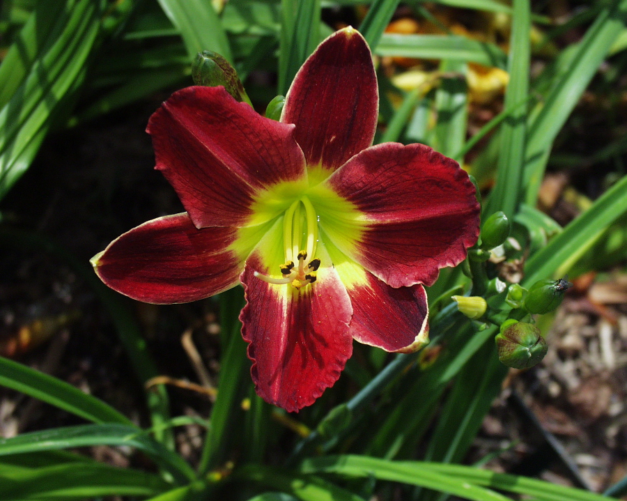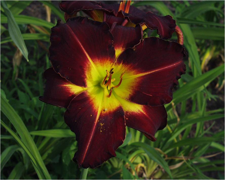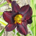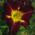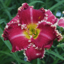 dunkel-weinrot, dunkel-rotes Auge, gelber Rand, schmaler gelb-grüner Schlund