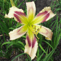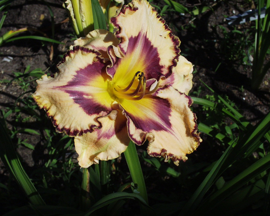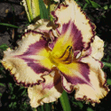 creme gelb weiss violette Mischung, schwarz-violettes Auge, violett und goldener Rand, grüner Schlund