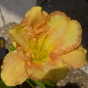 gelb-orange-rote Mischung, rotes Auge auf Petalen, gelb-grüner Schlund, in der Sonne glitzernd