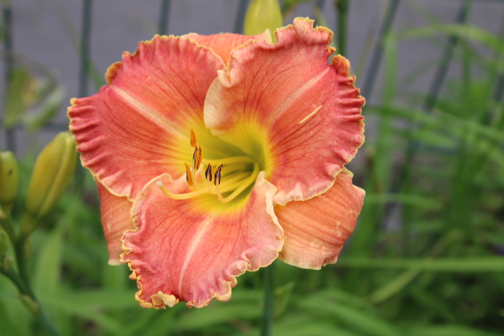 melonen-gelbe Mischung, purpurnes Auge, goldener und purpurner Rand, breite weite Mittelrippen, gelber Schlund