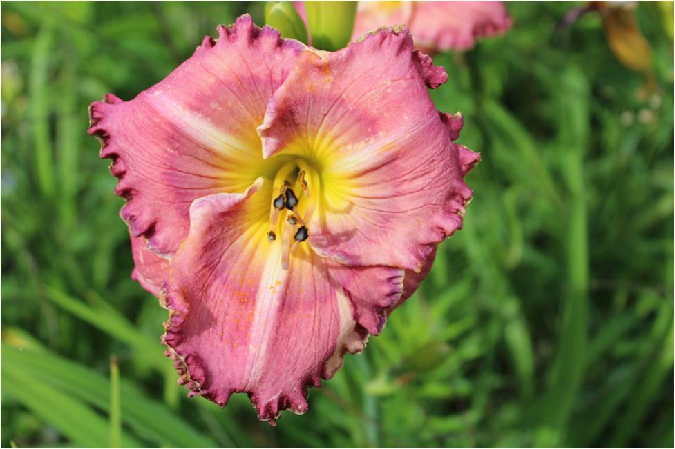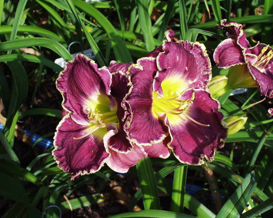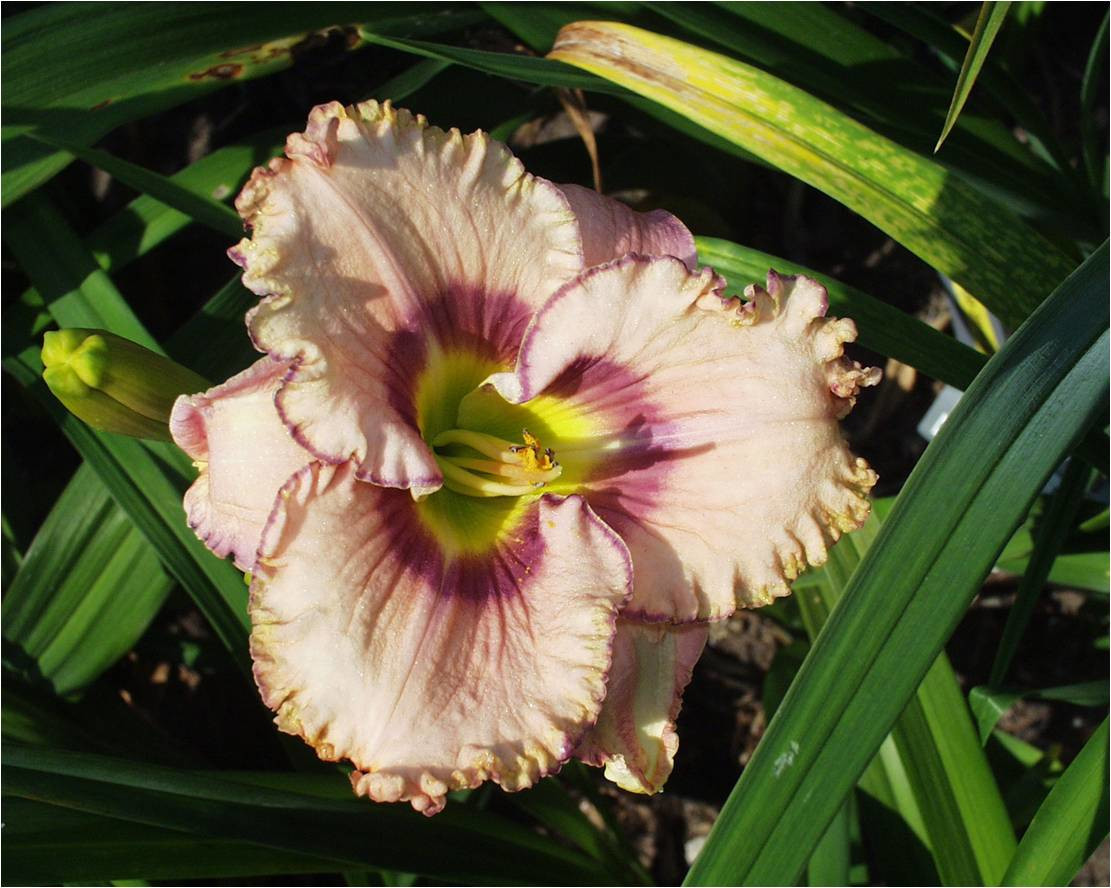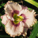 weiss violette Mischung, dunkel violettes Auge und Rand, gelb grüner Schlund, glitzert in der Sonne