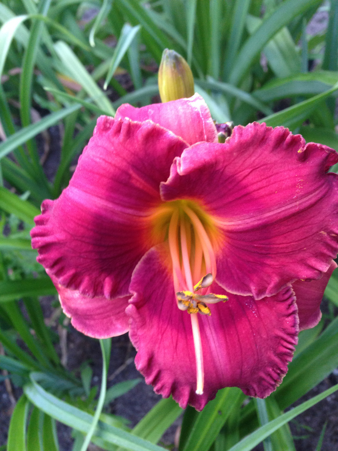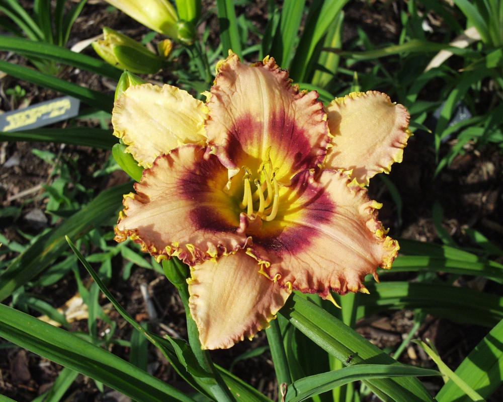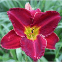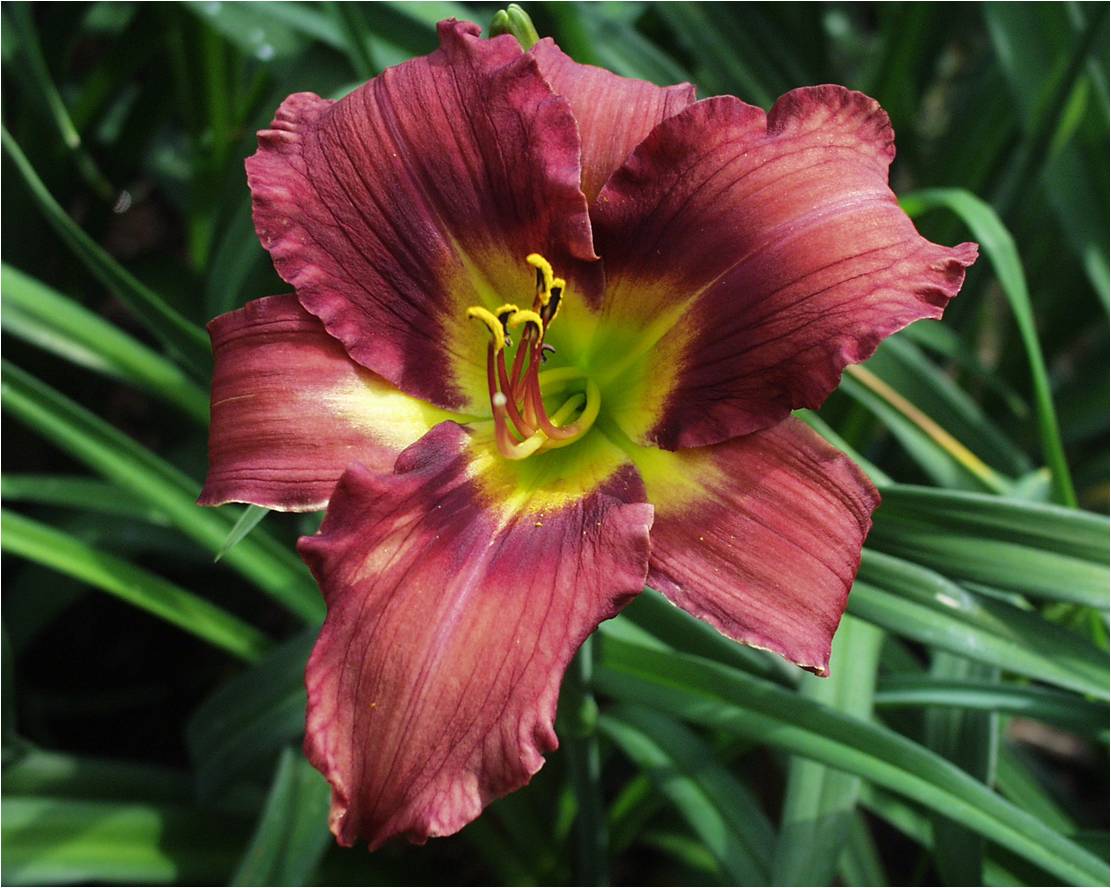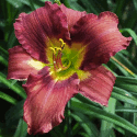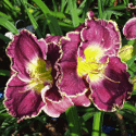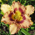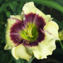 purpur rote Mischung, dunkel-violettes Auge, golden und silbriger Rand, gelb-grüner Schlund