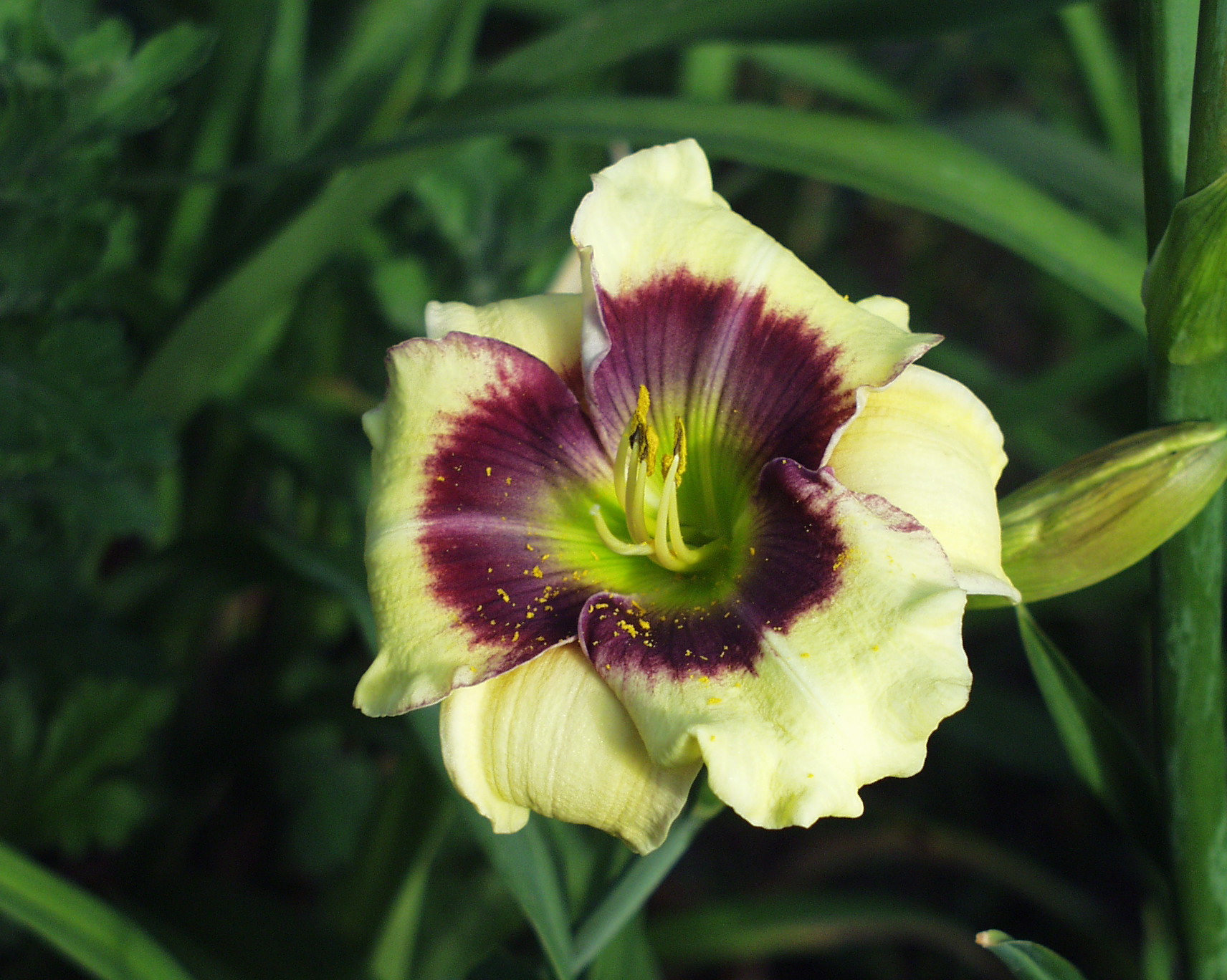 gelb weisse Mischung, blau-purpurnes Auge, grüner Schlund