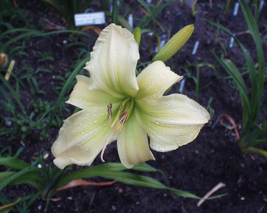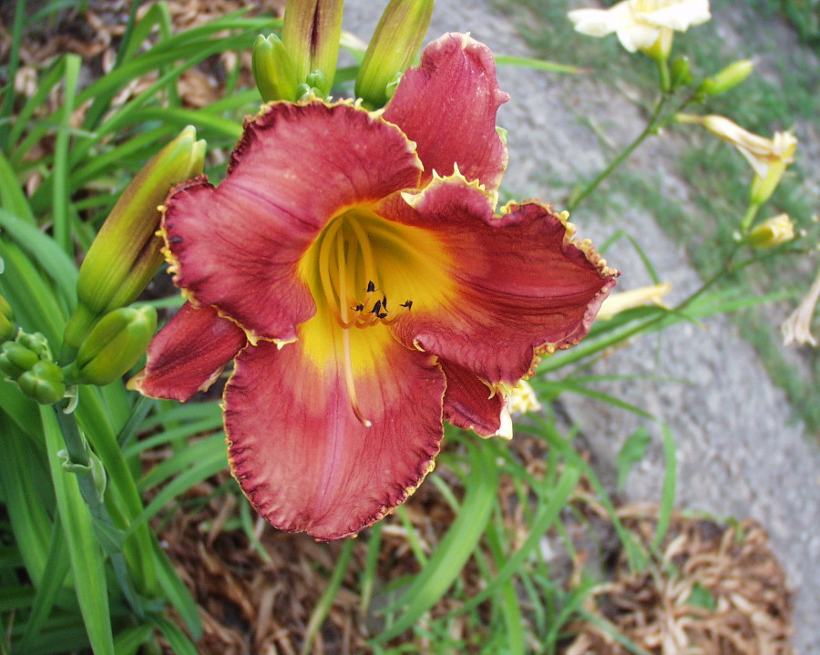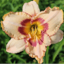 creme weiss gelbe Mischung, hell-weinrotes Auge, rötlich gefärbter Rand, grüner Schlund