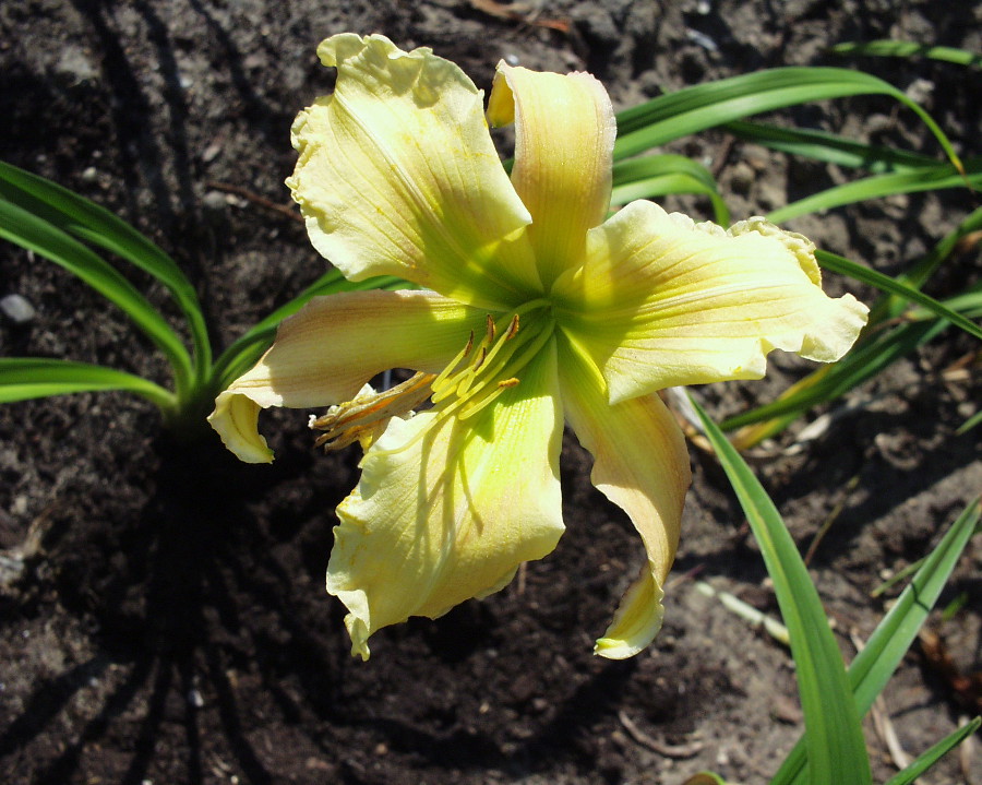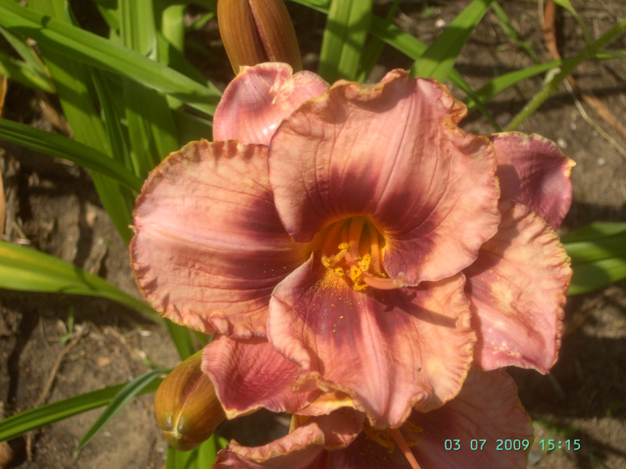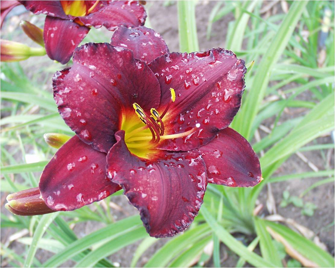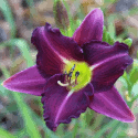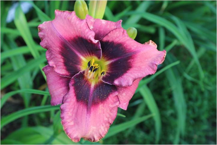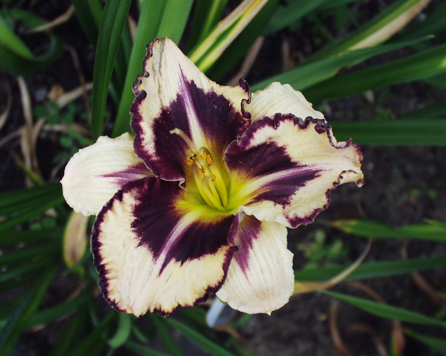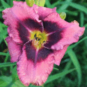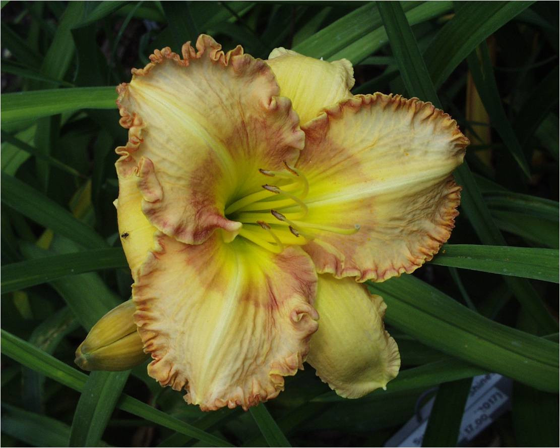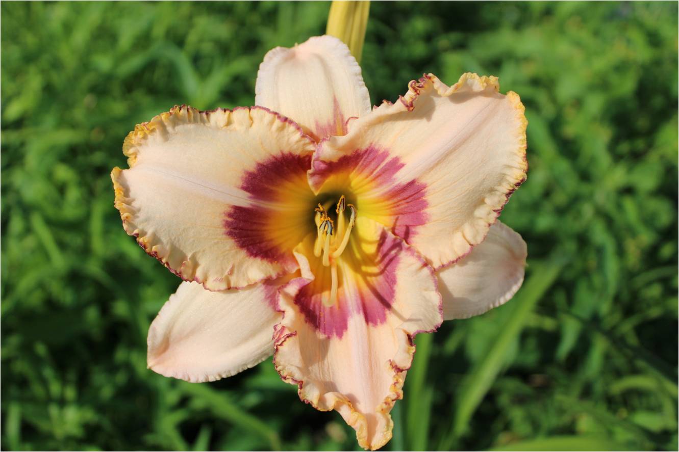 helle gelb purpurne Mischung, schwarz-purpurnes Auge, schwarz-purpurner Rand, äusserer geriffelter Goldrand an den Petalen, gelb-grüner Schlund