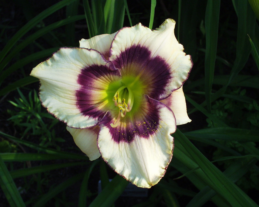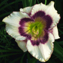 weiss-violette Mischung, schwarz-purpurnes Auge und Rand, gelb-grüner Schlund