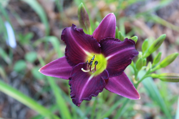 purpur, helle Mittelrippen auf Petalen, kleiner grüner Schlund