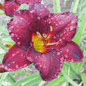 dunkel-karmin purpur Mischung, helleres Auge, gold gezähnter Rand, grüner Schlund