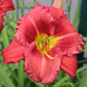 rot, dunkel-bordeau Auge, perforierter goldener Rand, gelb-grüner Schlund