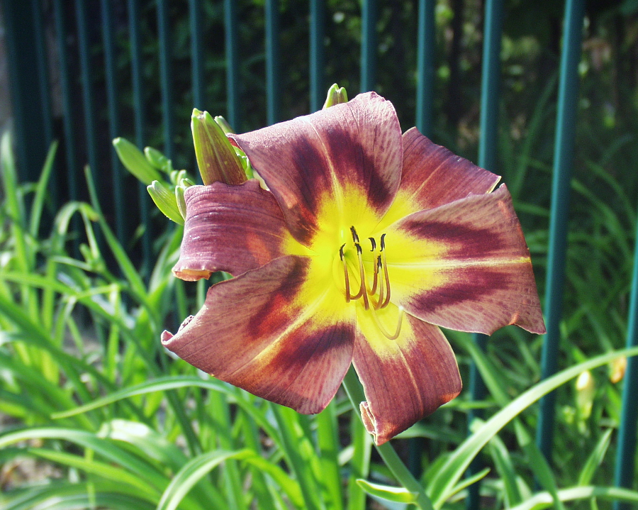 braun-violette Mischung, dunkel-violettes Auge, gelb bis grüner Schlund