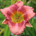 lachsfarbig mit dunklem lachsfarbigem Auge, goldener Rand, grüner Schlund