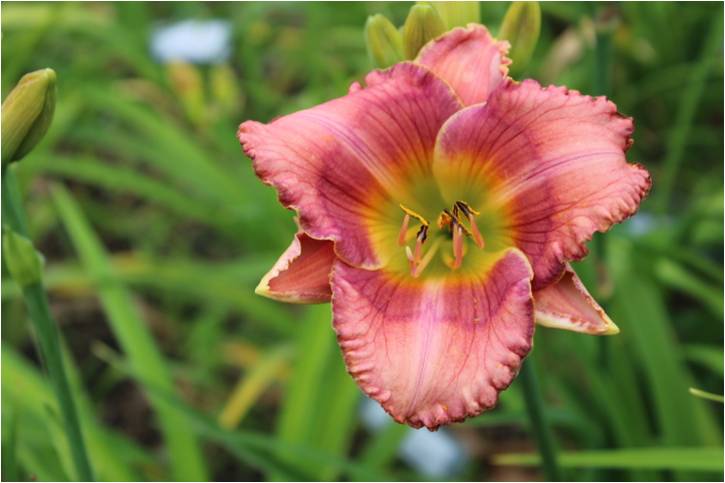 violett rote Mischung, dunkel violettes Auge und Innenrand, goldener Aussenrand, grüner Schlund