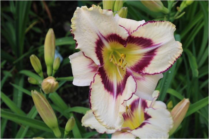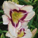 creme-weiss gelbe Mischung, violettes Auge und Rand, weisse Mittelrippen auf Petalen, grüner Schlund