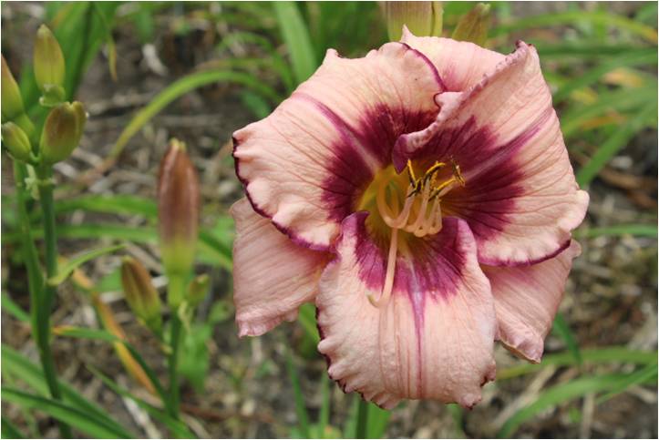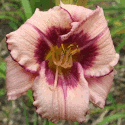 helles weinrot, schwarz-violettes Auge, schwarz-violetter innerer Rand und goldener äusserer Rand, grüner Schlund