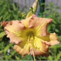 hell-violett gelbe Mischung, gelbe Fläche auf Sepalen, violettes Auge, grüner Schlund
