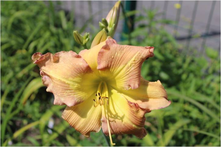 weiss-gelbe Mischung, hell-violettes Auge und Rand, violette Streifen auf Petalen, grüner Schlund