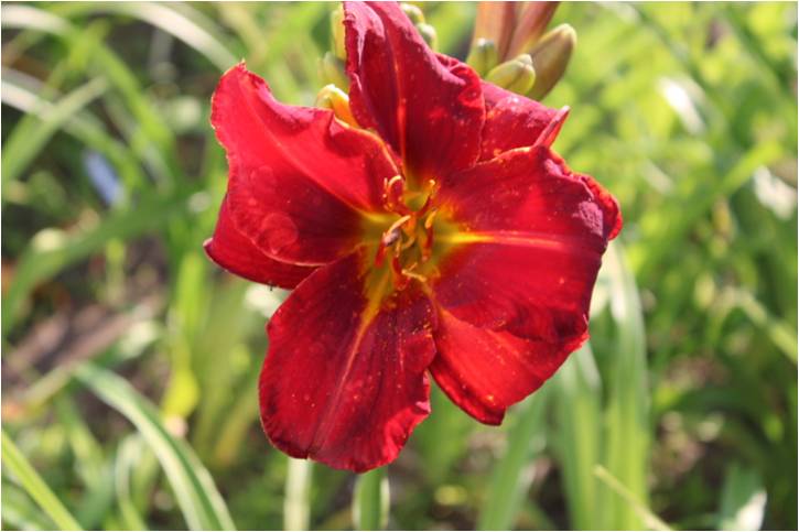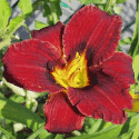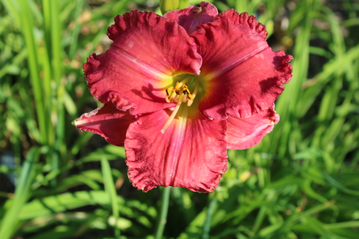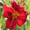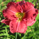 karmin-rote Petalen und hellere Sepalen, rot-purpurnes Auge, gelb-grüner Schlund