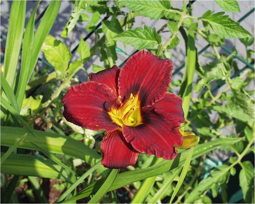dunkel violett-rote Mischung, dunkles Auge, starker gelber Rand, grüner Schlund