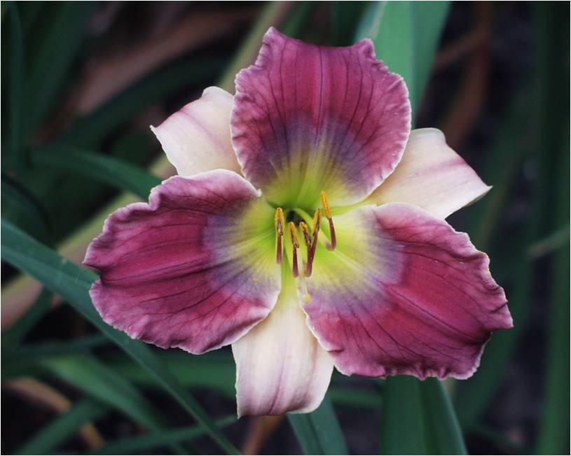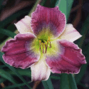 weinrot violette Mischung auf Petalen, hell-weinrot violette Mischung auf Sepalen, violett-blaues Auge, weisser Rand, grüner Schlund