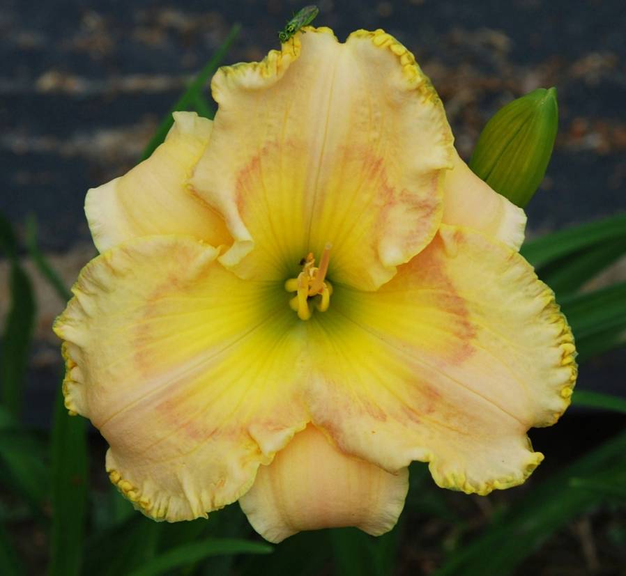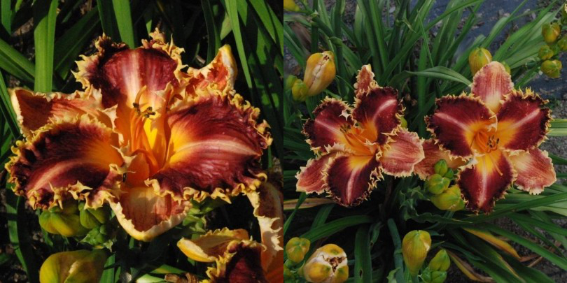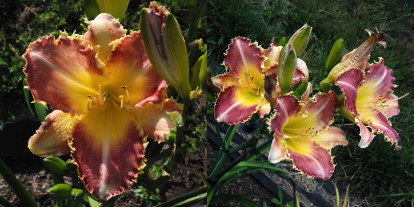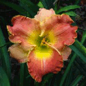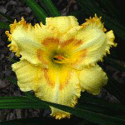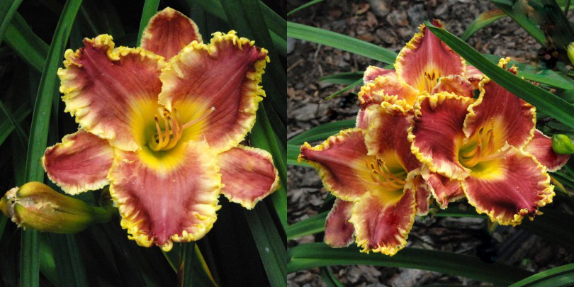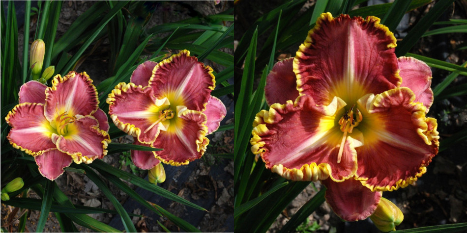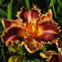 Colour: waxy rose red, edge serrated gold ruffles, with a green to yellow throat