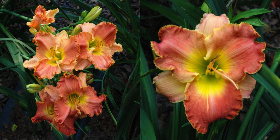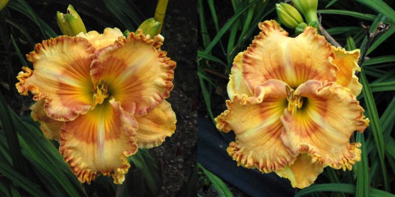 Colour: yellow orange with double orange purple edge above washed purple eyezone and green throat