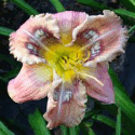 Colour: pastel coral pink with medium blue purple eye and edge with outer gold trim above green throat