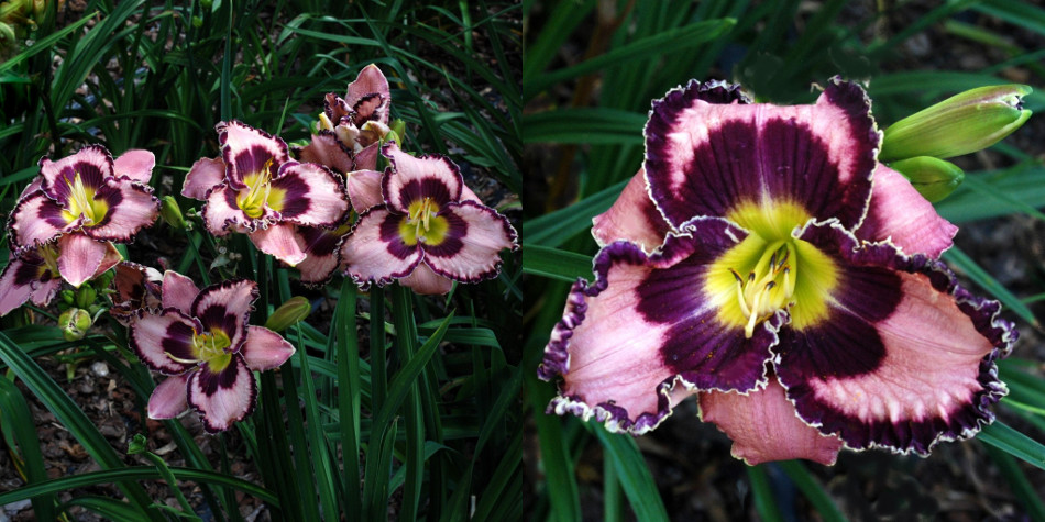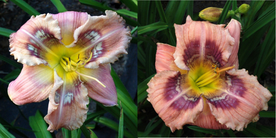 Colour: coral pink petals and sepals, dark purple eye and edge, white outer edge, green throat