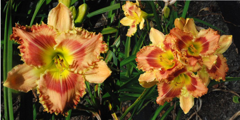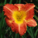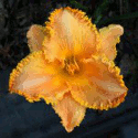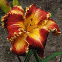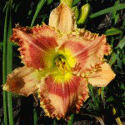 Colour: pale melon self with red eyezone, two color red and yellow jagged edge above green to yellow throat