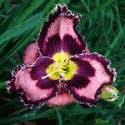 Colour: rose red with blue lavender eye and white edge above green throat