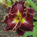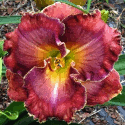 Colour: burgundy red with heavy gold toothy edge above yellow throat