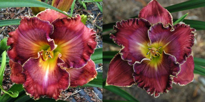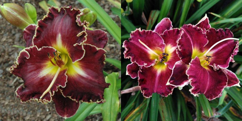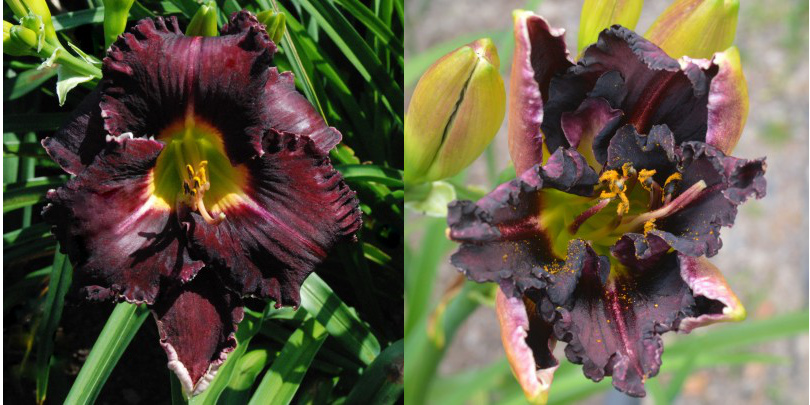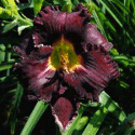 Colour: black purple self with ruffled edge above green throat