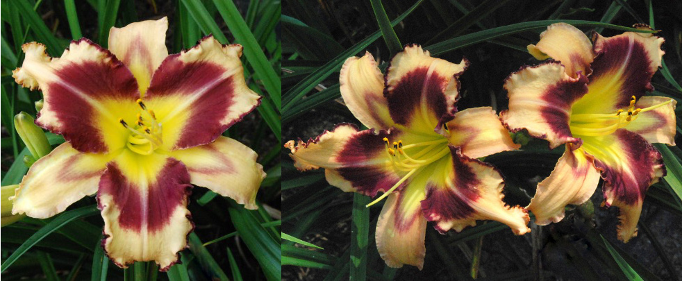 Colour: light cream with dark purple eyezone and edge above a green to yellow throat, pattern repeated on sepals