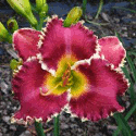 Colour: burgundy purple with thin yellow wavy edge and white midribs above green to yellow throat