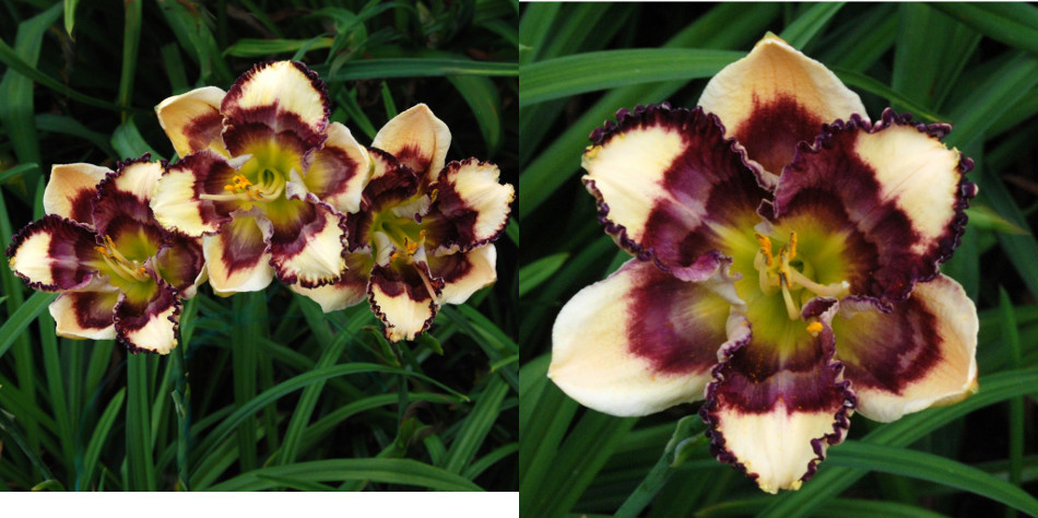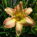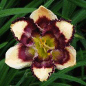 Colour: cream with purple, violet, gray and green eyezone, dark violet edge above green throat
