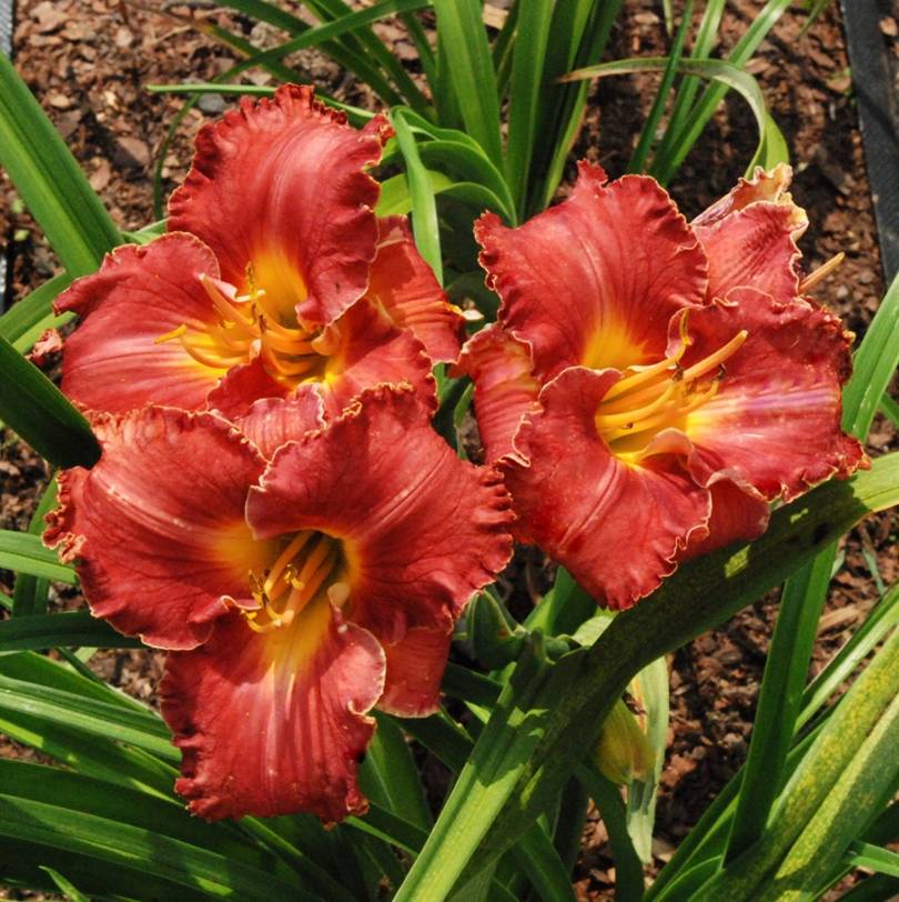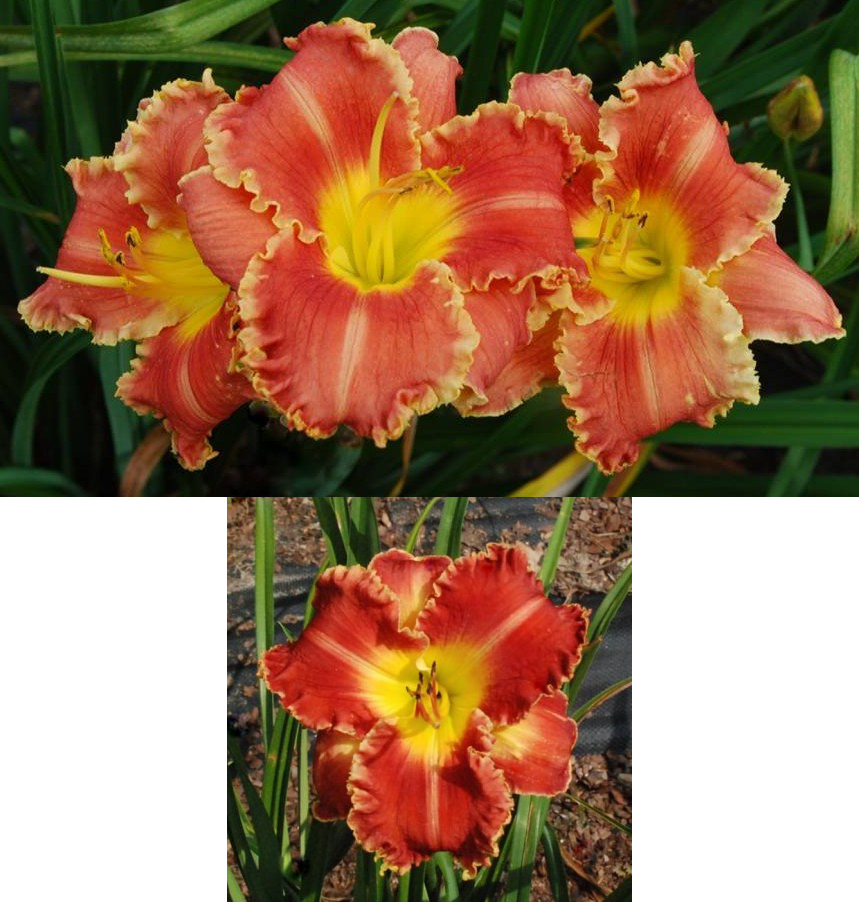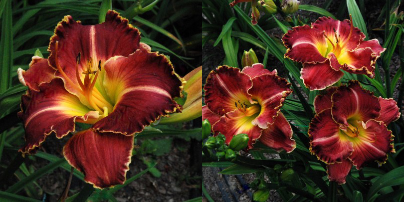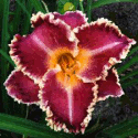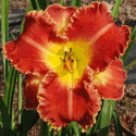 Colour: blood red with ivory cream edge above yellow throat
