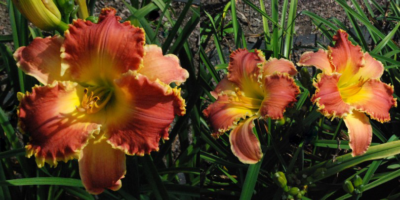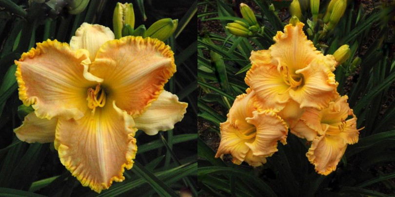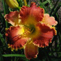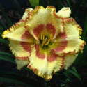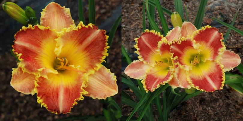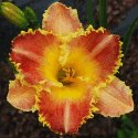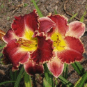 Colour: scarlet red with bright ruffled gold edge above green to yellow throat