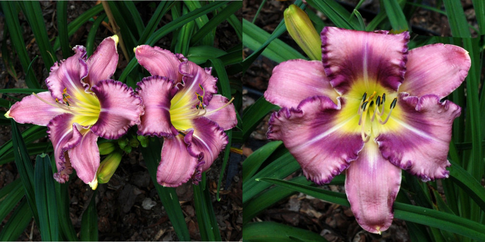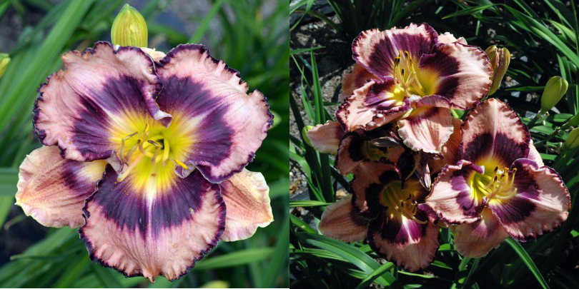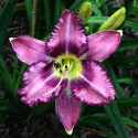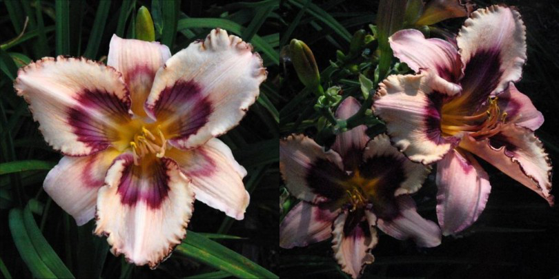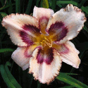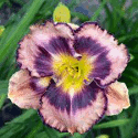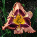Colour: purple rose with violet blue eye and silver toothy edge above yellow throat