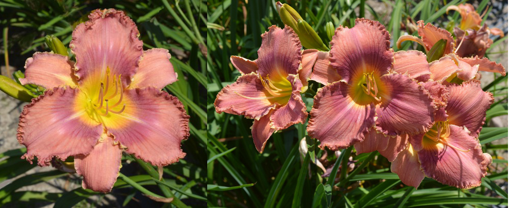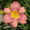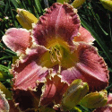 Colour: pink with lavender eye and small ruffled edge above green to yellow throat