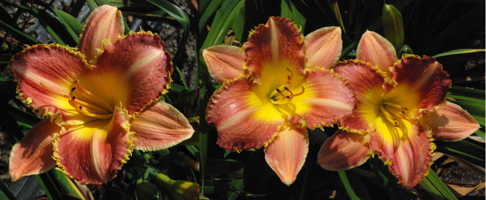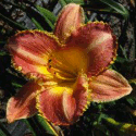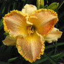 Colour: coral rose self with small jagged gold edge above large yellow throat