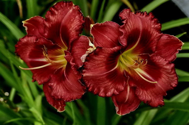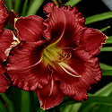 deep raspberry red with a large darker striking eye, edges of petals are wavy with a fine black edging, small green throat, narrow midribs