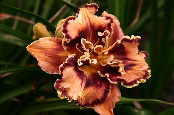 light ochraceous buff with dark red mahogany eye and edge surrounded by a navajo white outside edging, green throat, light ochraceous sepals with dark goldenrod center