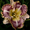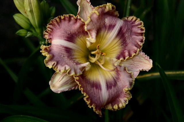 clear purple with tints of lilac, bright burgundy eye, undulating gold edges, white midribs, large yellow pastel throat, sepals are creamy pink with lilac wavy margins