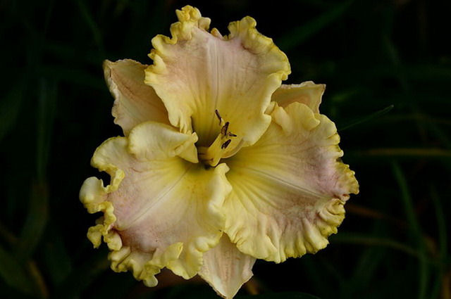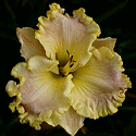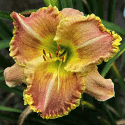 clear light rose lilac with large heavy ruffled yellow edge with a dark gold edging, bright yellow throat