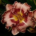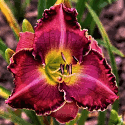 old dark rose, red purple eye and edge, edges are undulated and surrounded by a golden edging, yellow orange throat