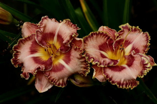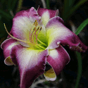 lavender pink self changes to orchid pink, very dark green throat extending to a large yellow watermark, gold ruffled edge with small teeth and chartreuse sections