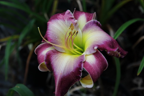 dark purple self with a grass green throat extending a yellow gold pattern applique, aubergine halo and margins outlined with a silvery edging